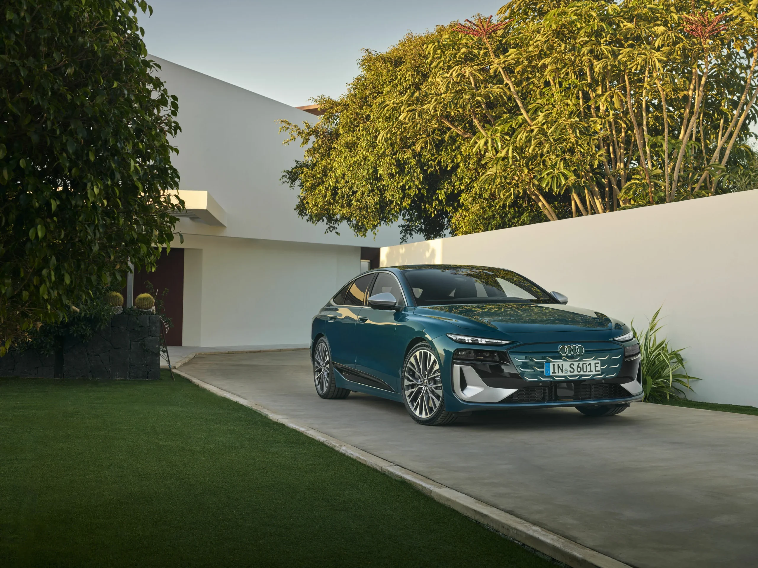 O novo Audi S6 Sportback e-tron em Malpelo Blue Metallic reflete o seu caráter desportivo para o mundo exterior, com elementos específicos S, como emblemas e para-choques, bem como detalhes em cromado.