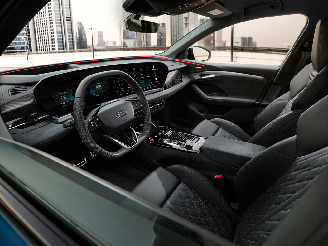 O Audi SQ6 Sportback e-tron apresenta um novo conceito de interior. A construção estruturada com materiais de alta qualidade e elementos específicos S cria clareza visual.
